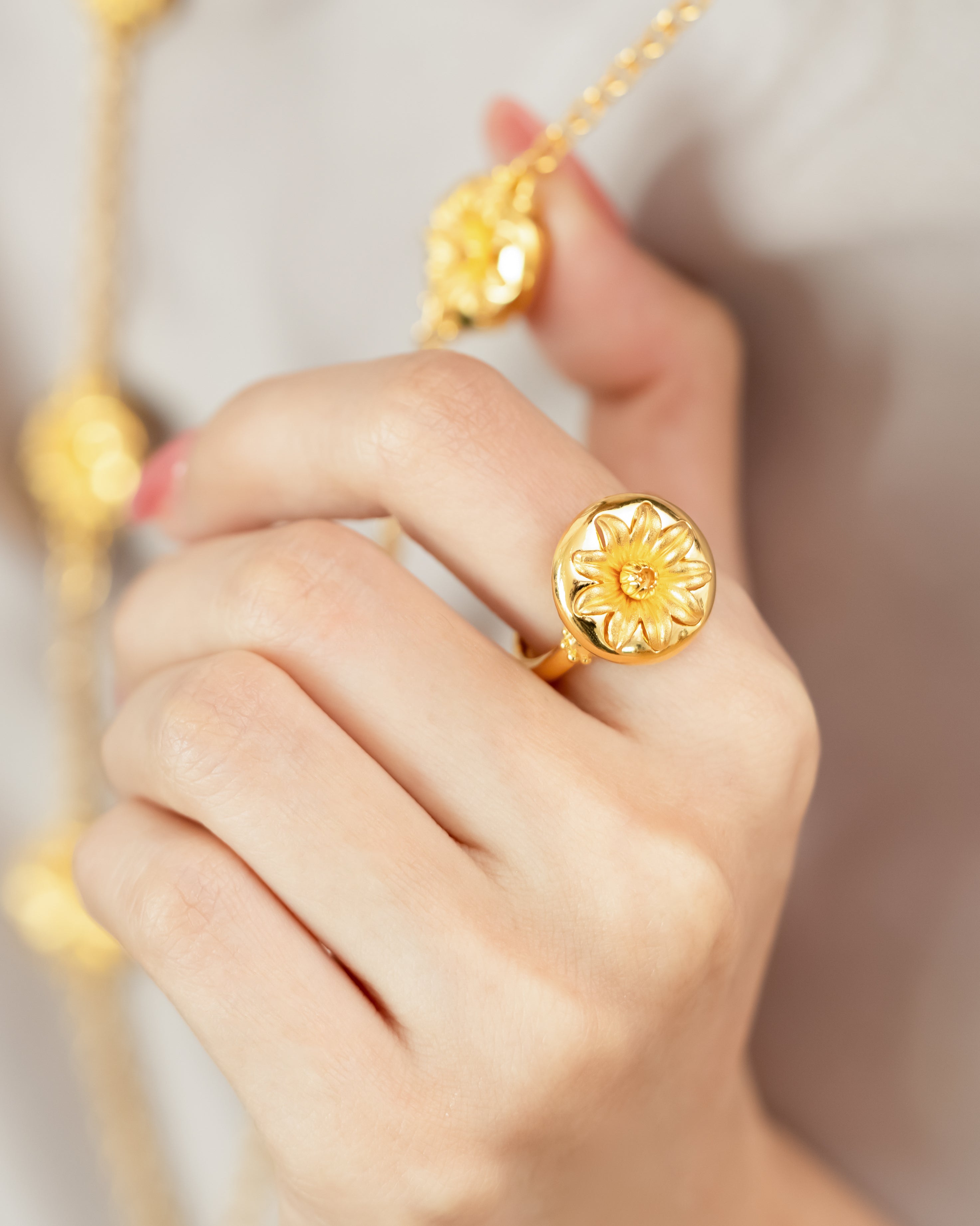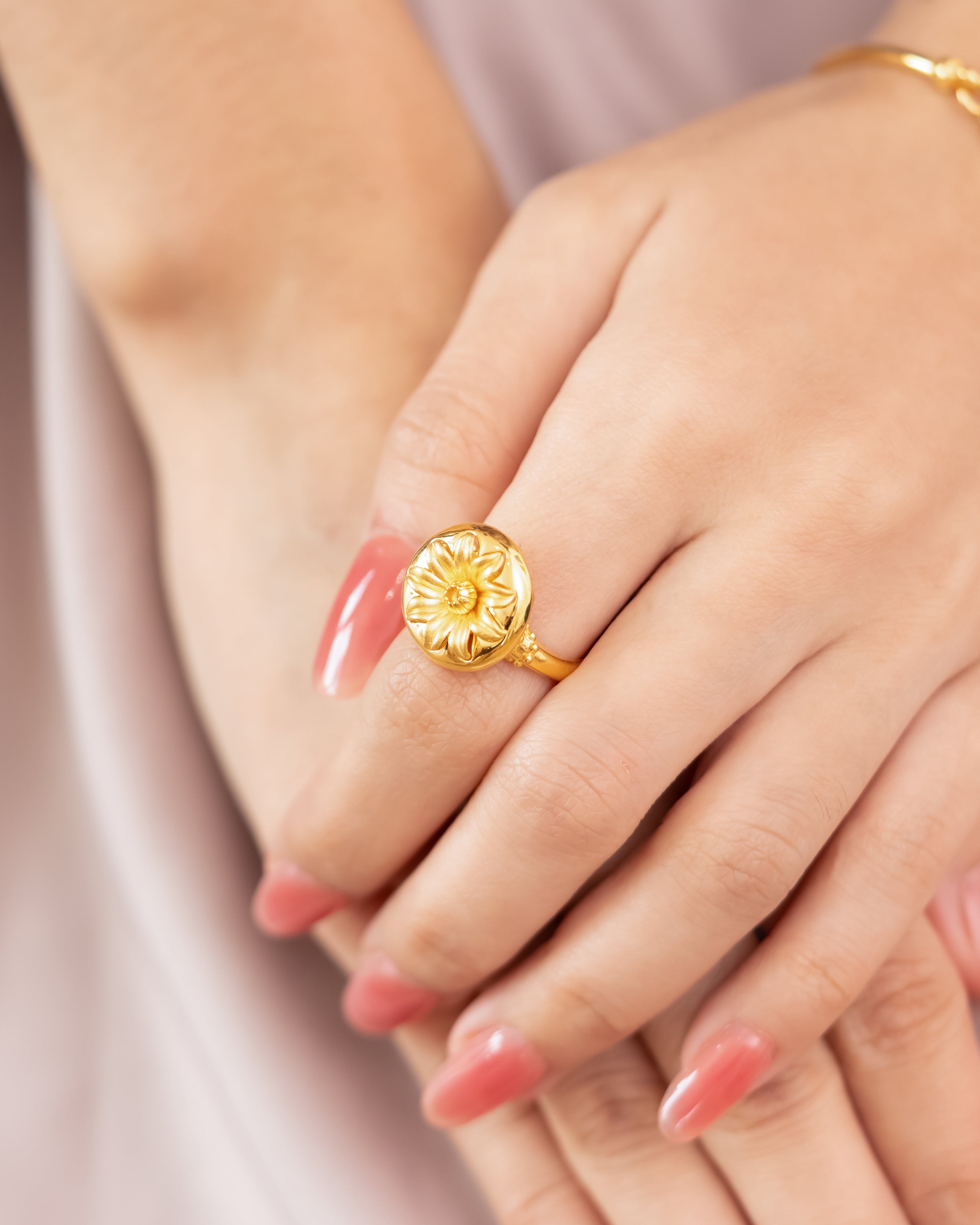 Cincin emas 916/22K dengan motif Bunga Tanjung mekar yang elegan. Direka dengan batang cincin yang nipis dan selesa dipakai, menyerlahkan gaya feminin yang klasik dan berseri dalam setiap penampilan.