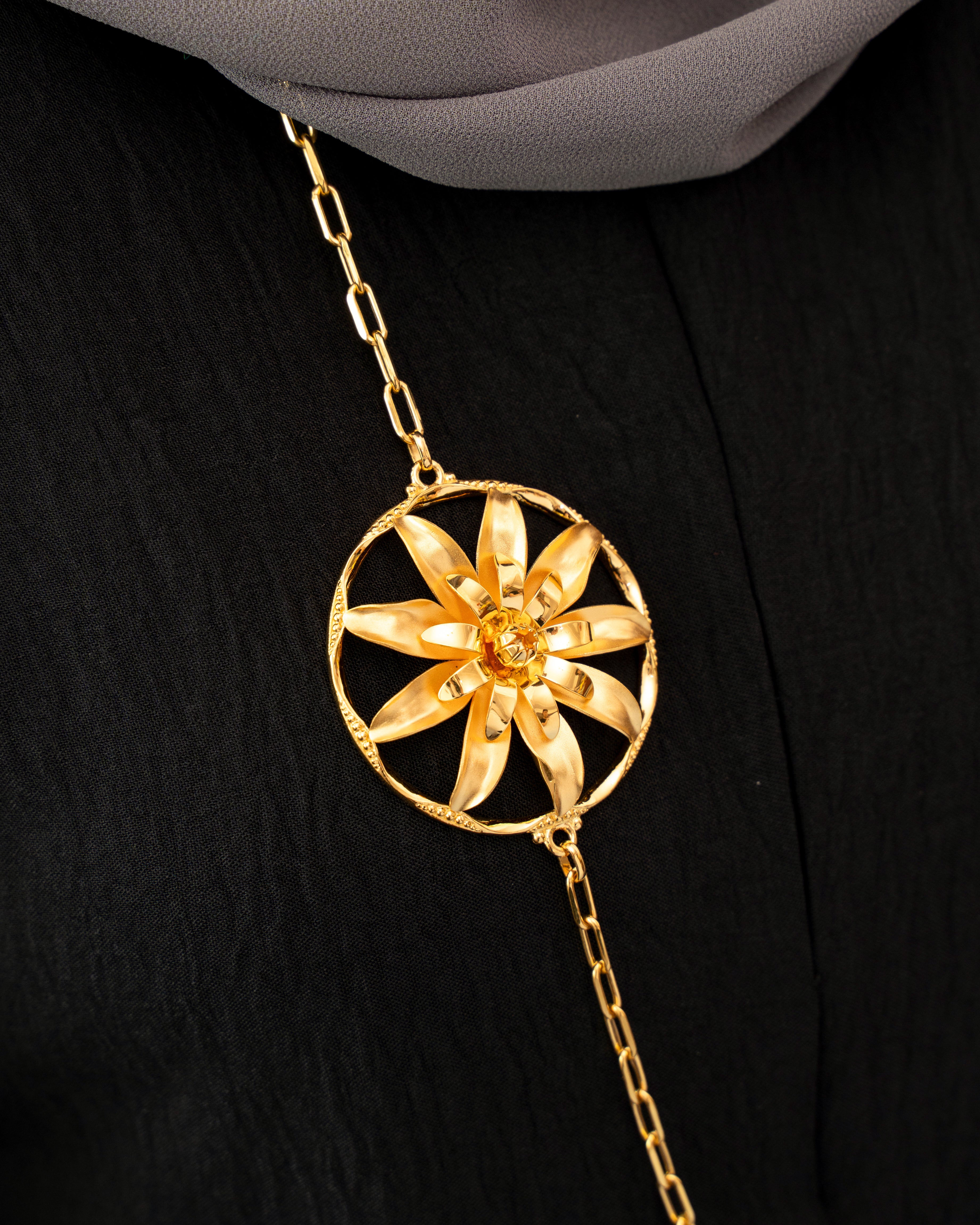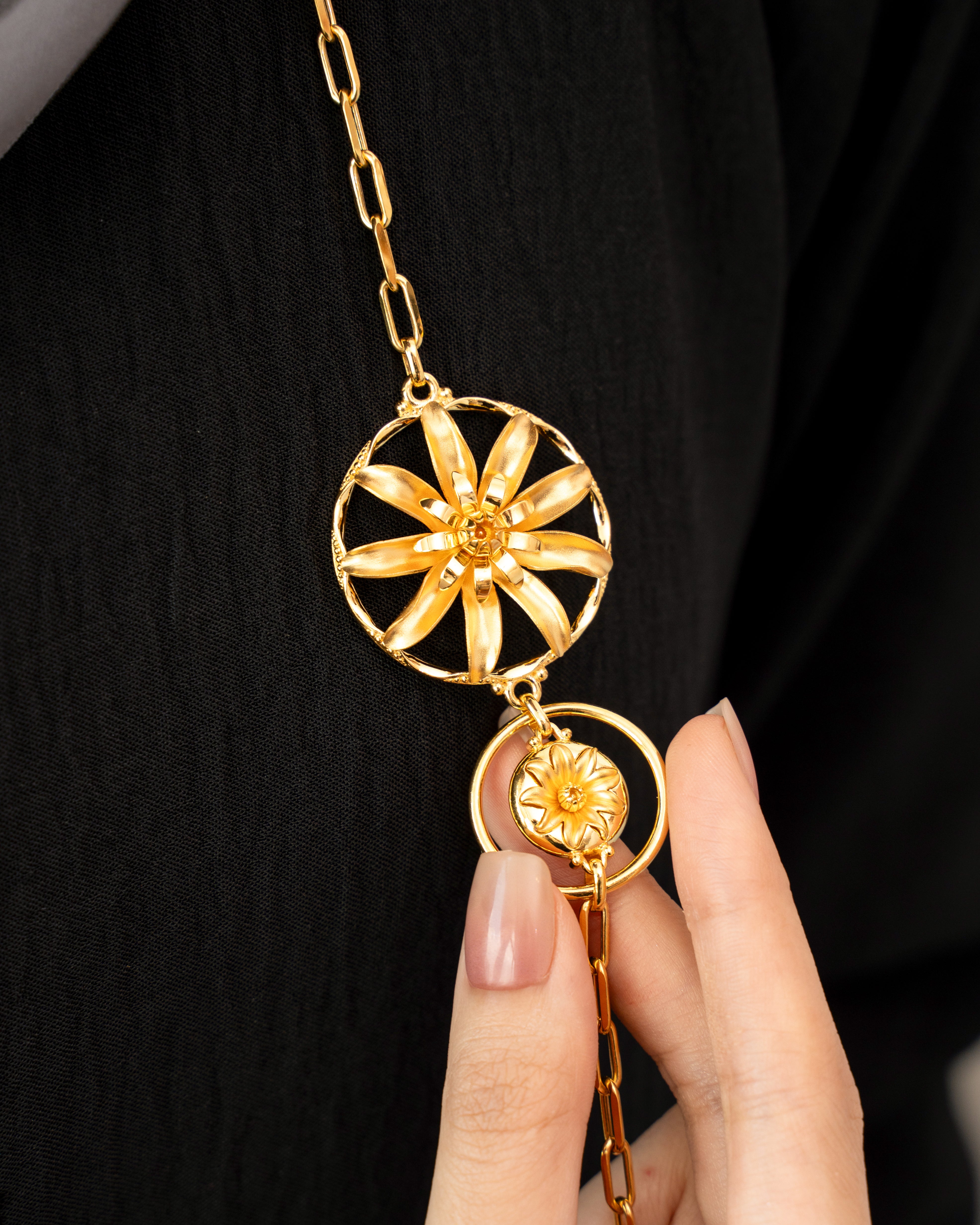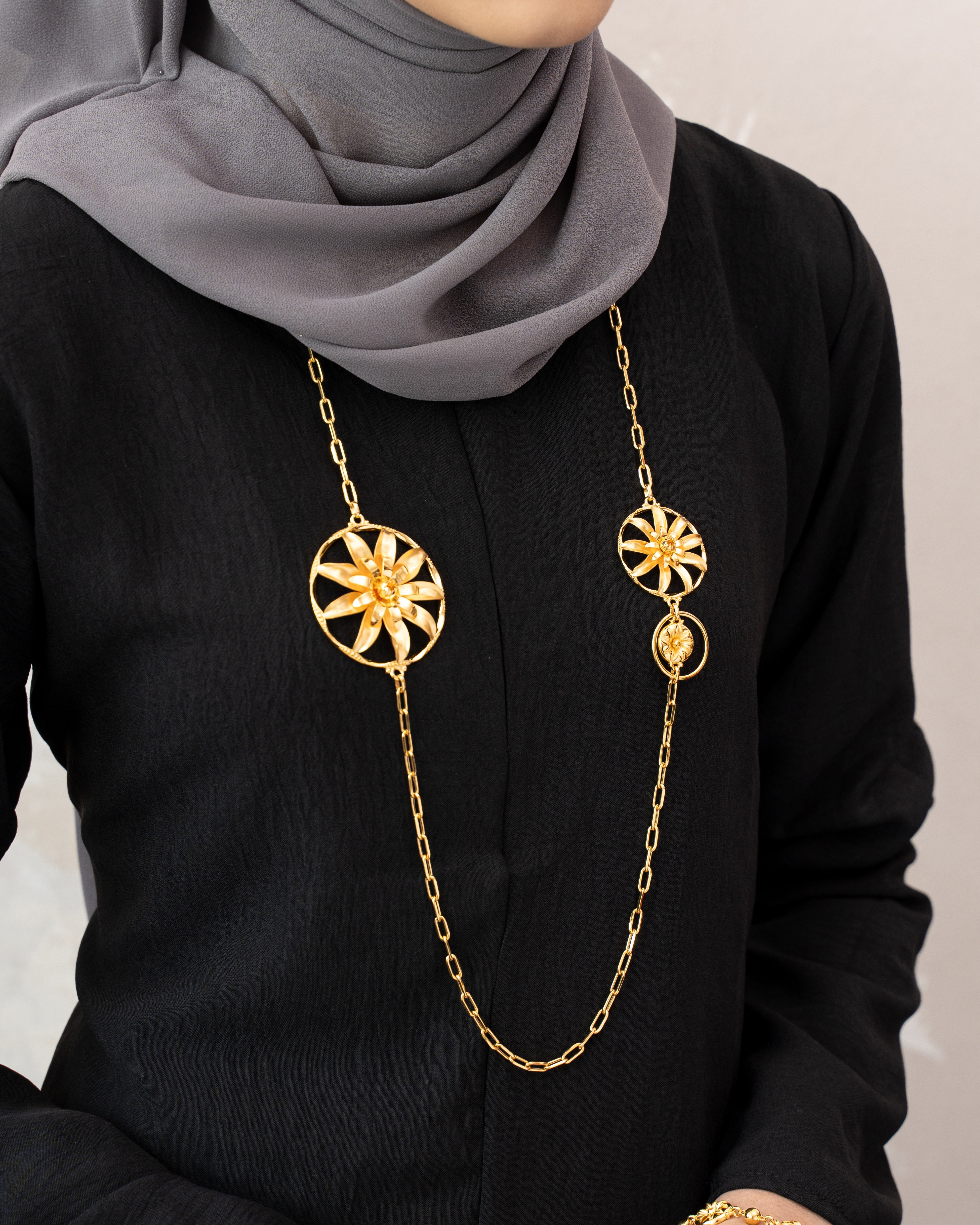 Rantai leher emas 916/22K dengan motif Bunga Tanjung yang mekar penuh, melambangkan kecantikan dan keyakinan wanita. Rekaan bunganya yang lebih terbuka menyerlahkan kilauan emas dari setiap sudut.
