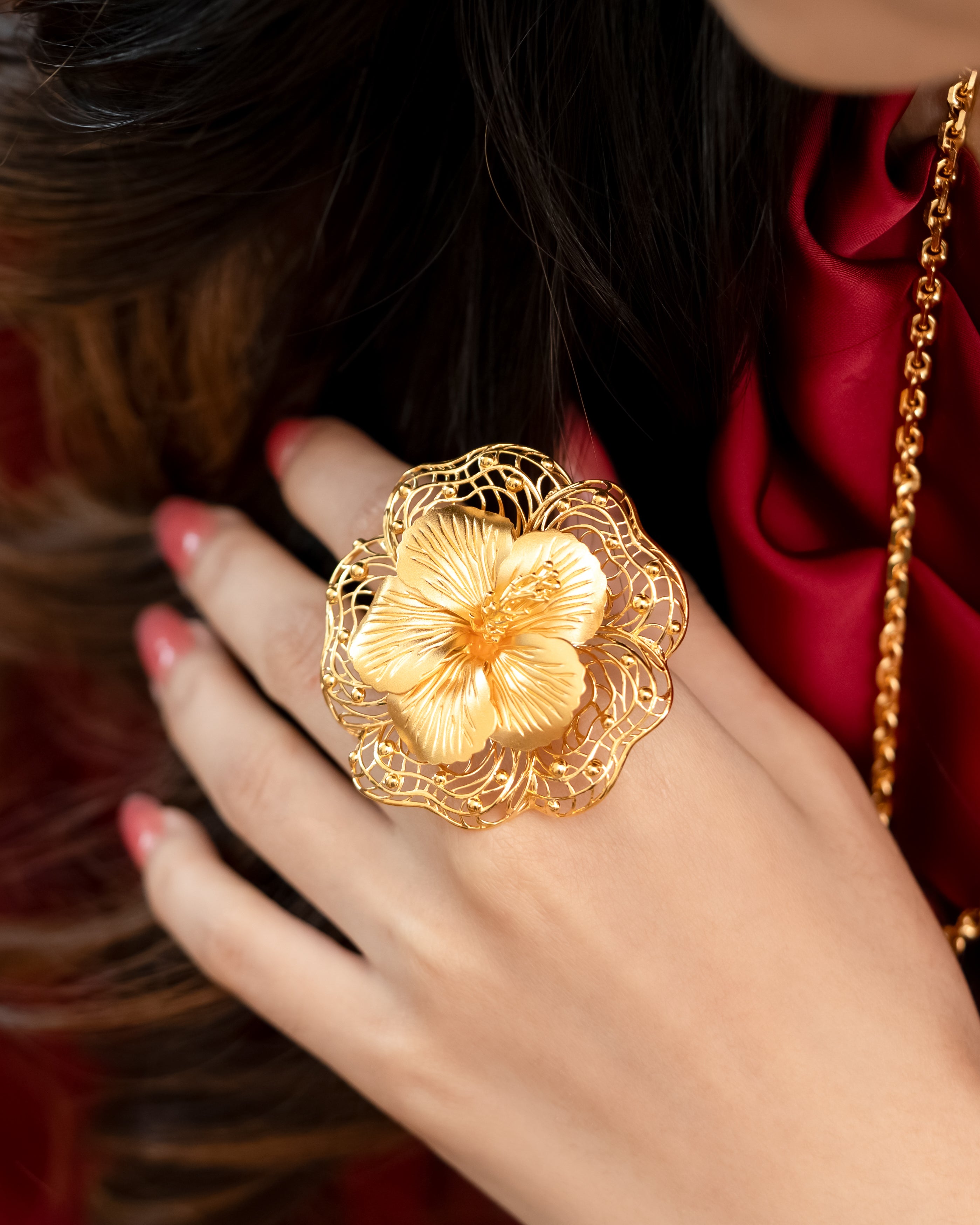 Cincin emas 916/22K ini menampilkan motif Bunga Raya yang mekar indah. Dalam budaya Melayu, Bunga Raya melambangkan keindahan, keberanian, dan semangat patriotik. Setiap kelopak direka dengan teliti untuk menangkap cahaya, memancarkan kilauan emas dari setiap sudut, menyerlahkan keanggunan, keyakinan, dan aura positif pemakai.