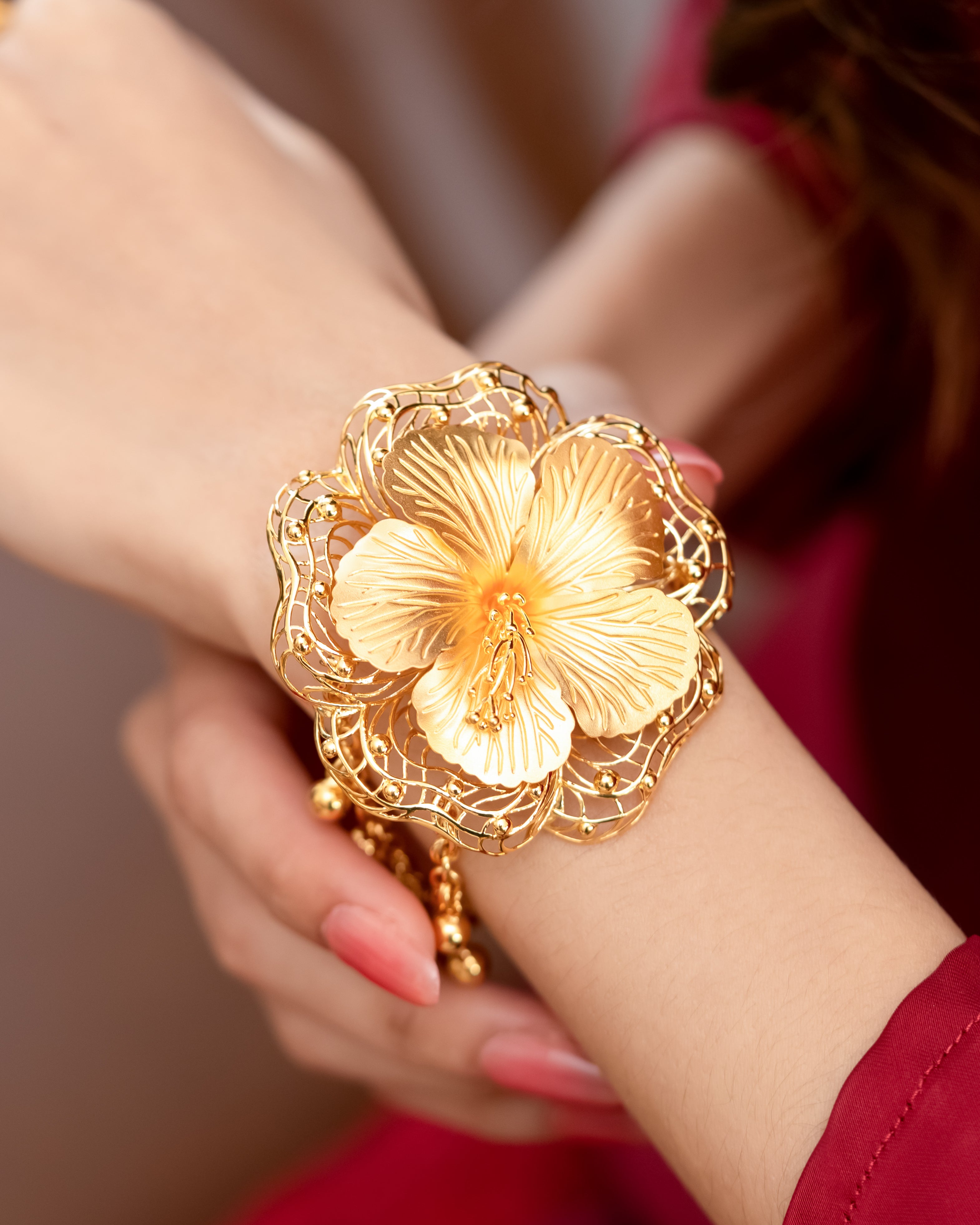 Hiasi pergelangan tangan anda dengan POH KONG Bunga Raya Gelang, emas 916/22K yang menampilkan motif Bunga Raya yang mekar indah. Dalam budaya Melayu, Bunga Raya melambangkan keindahan, keberanian, dan semangat patriotik.