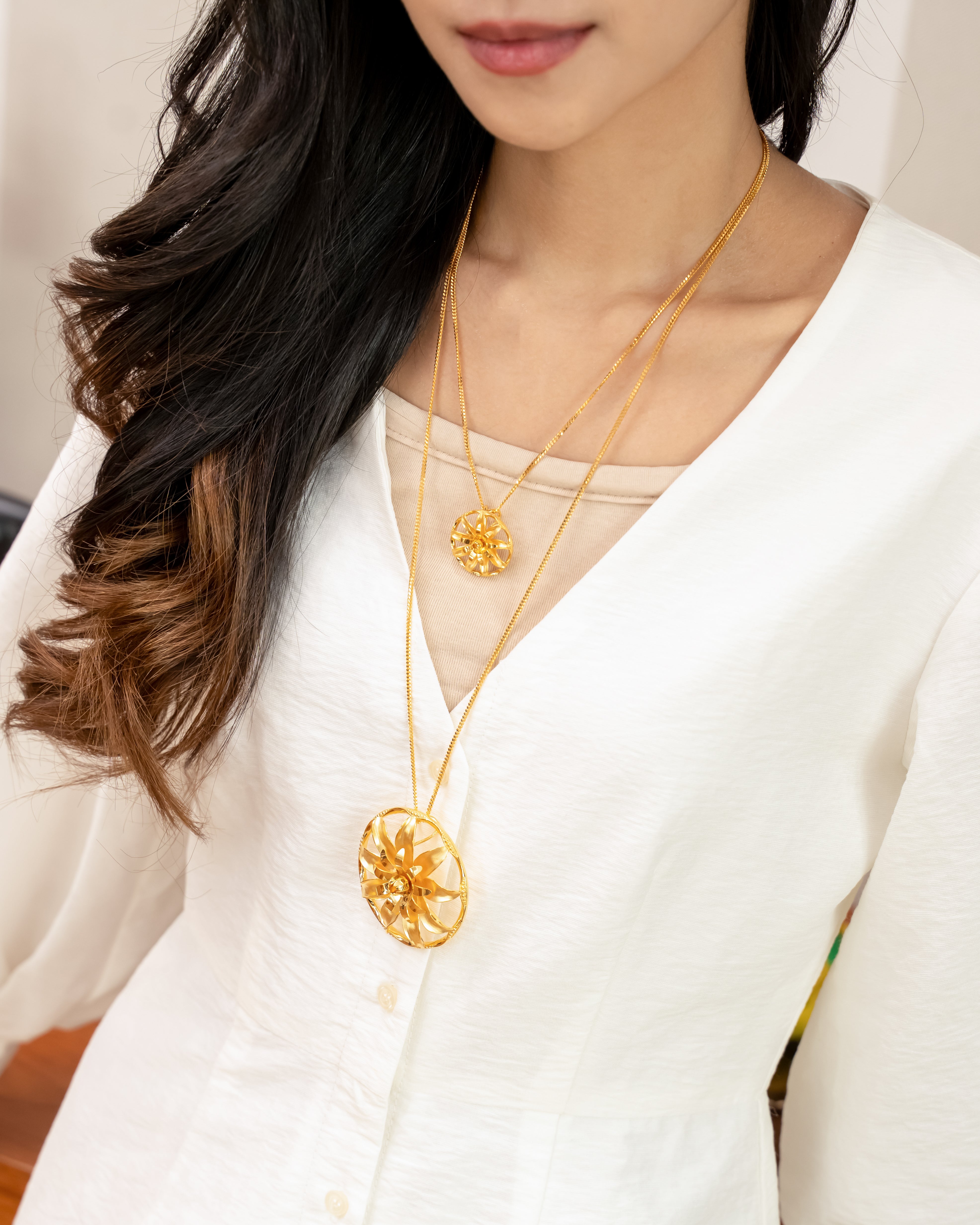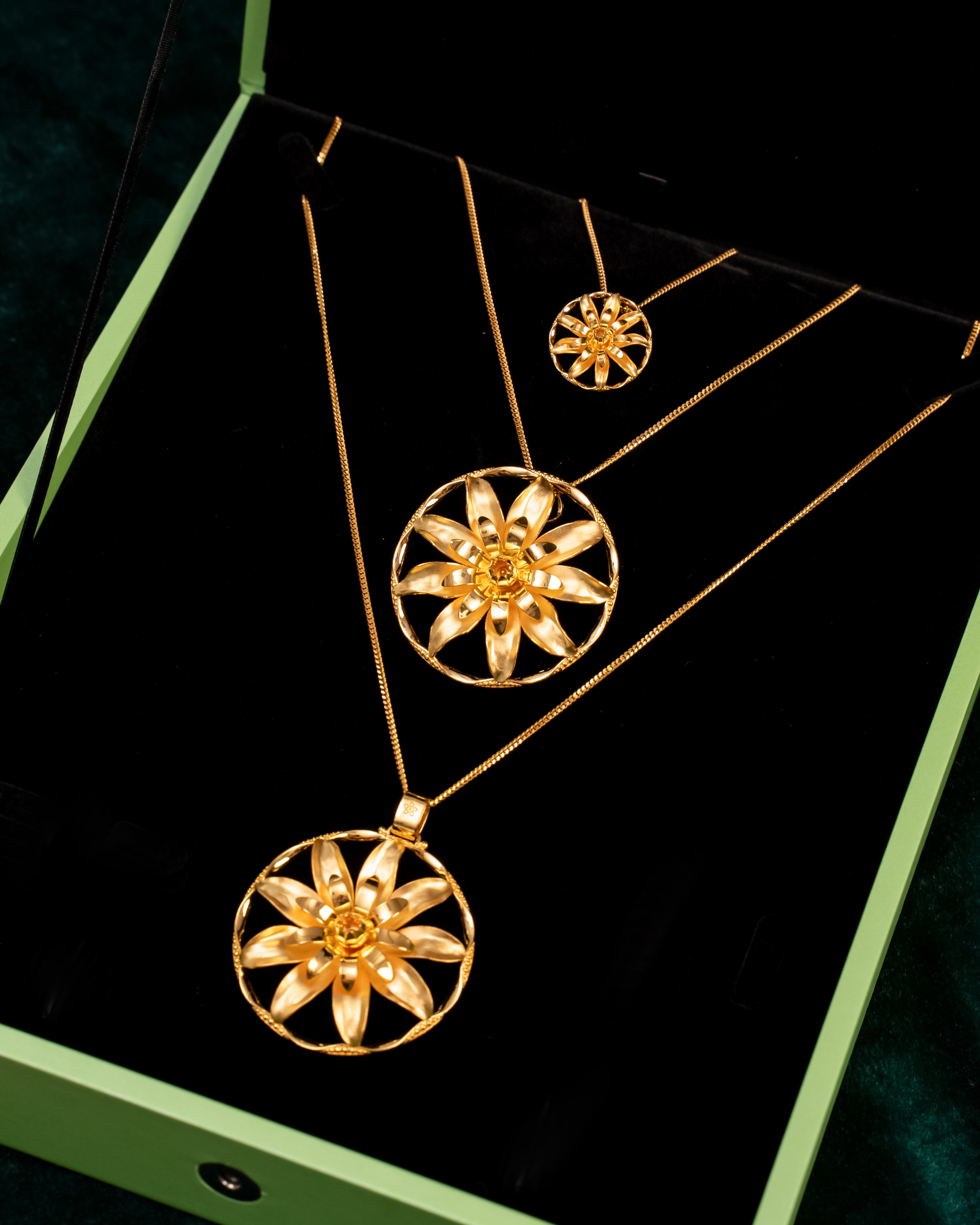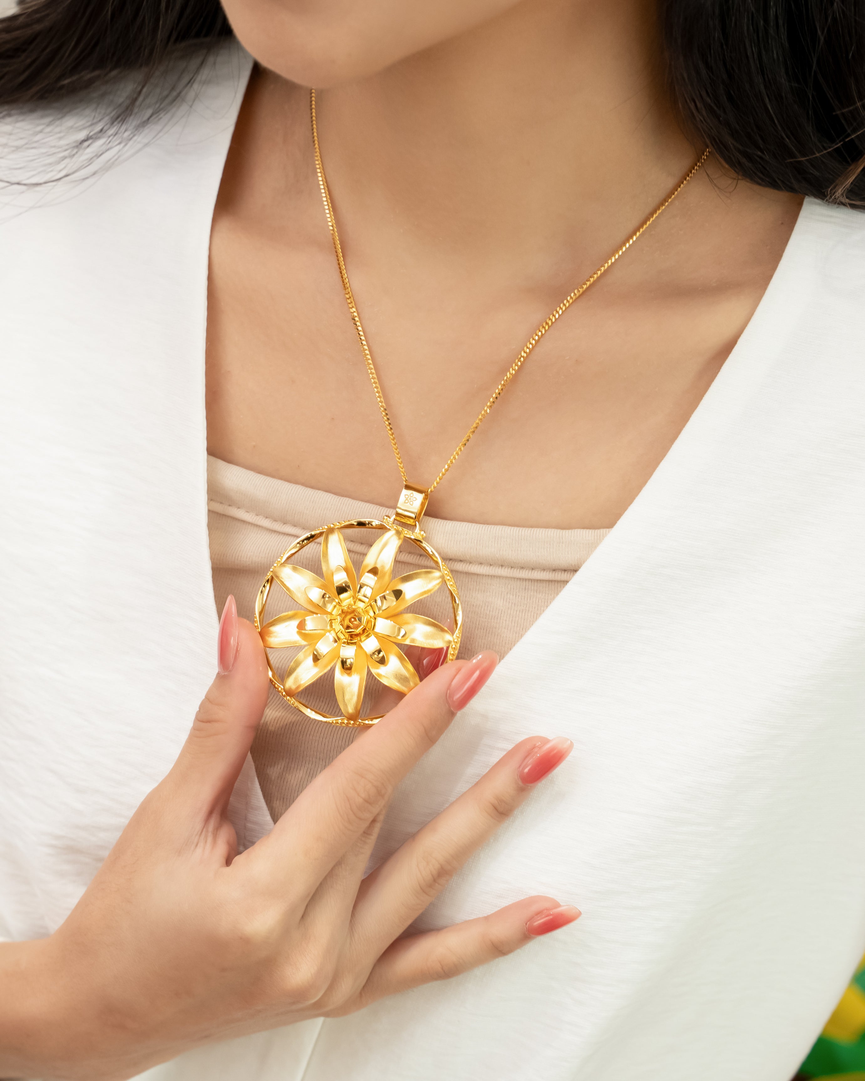 Hiasi penampilan anda dengan POH KONG Bunga Tanjung Mekar Bulat, emas 916/22K yang menampilkan motif Bunga Tanjung mekar sempurna dalam bentuk bulat.
