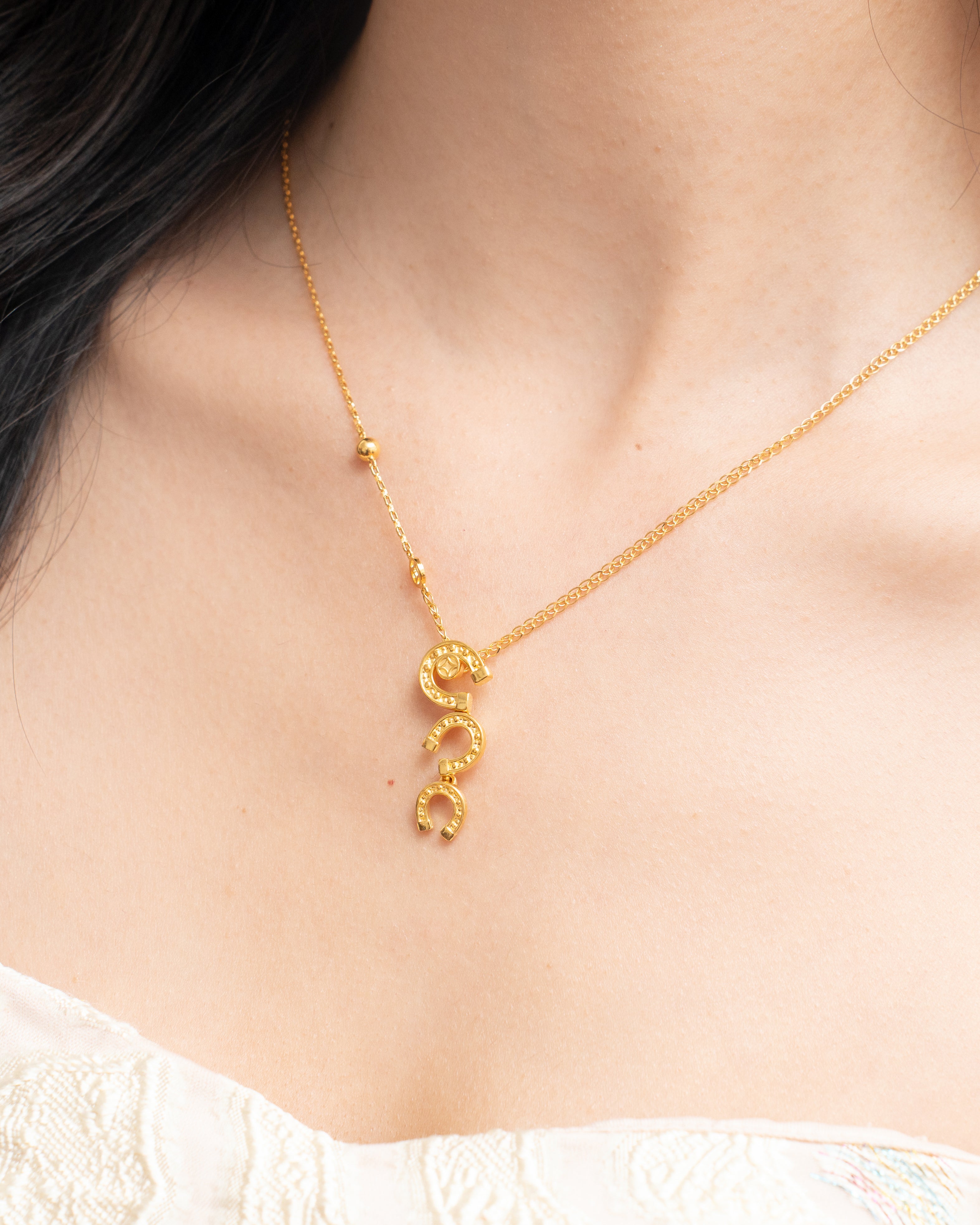 Three gold horseshoes are intricately engraved with fine textures and paired with a sleek chain, creating a refined yet luxurious look. With the horseshoes opening downward, the design symbolises good fortune pouring in from above — “luck flowing in”. The layered horseshoes represent compounded good fortune, noble benefactors by one’s side, and endless blessings. The naturally flowing drop enhances the neckline with understated elegance.