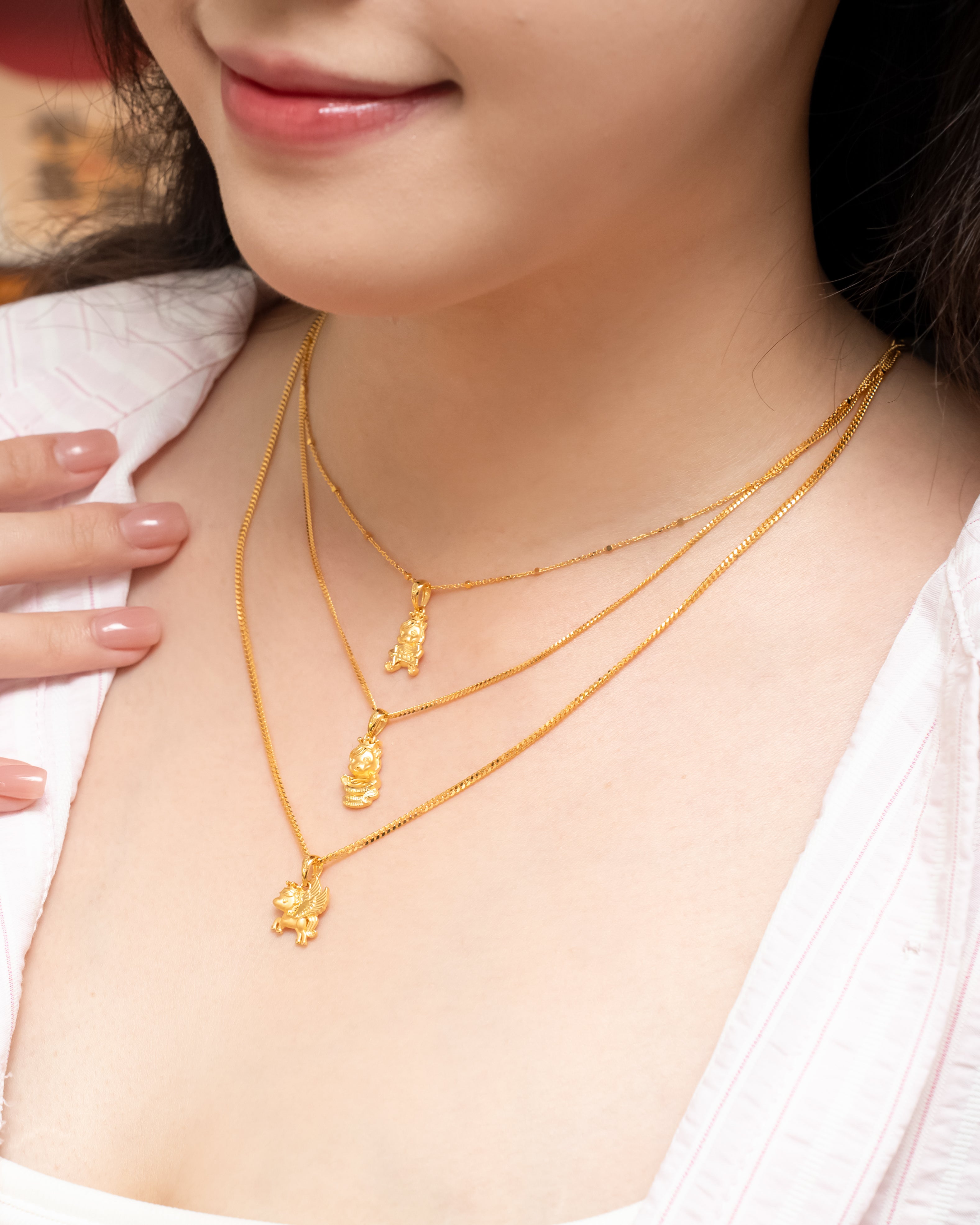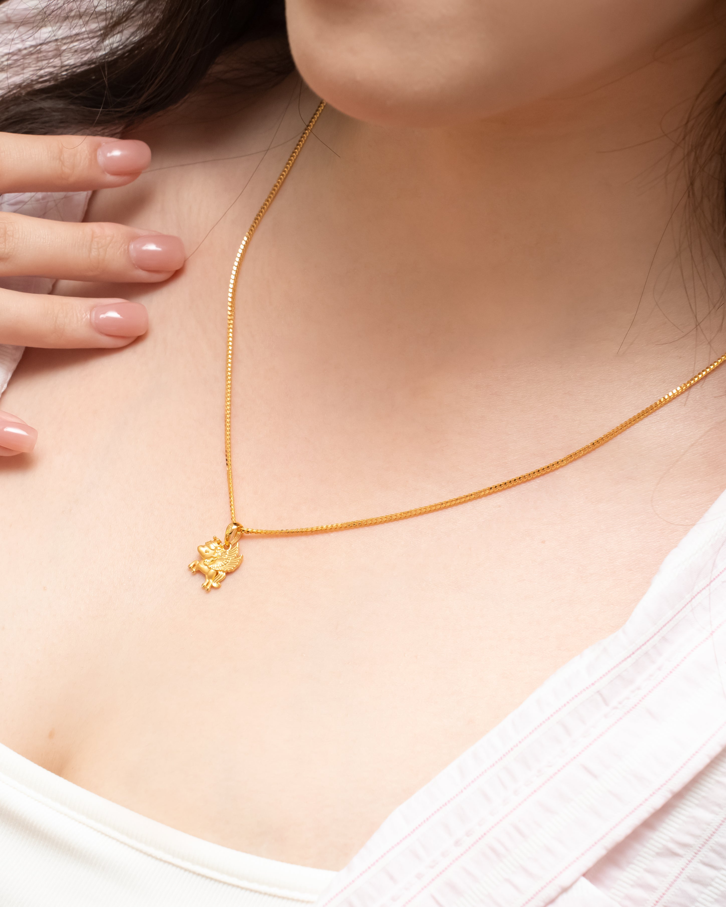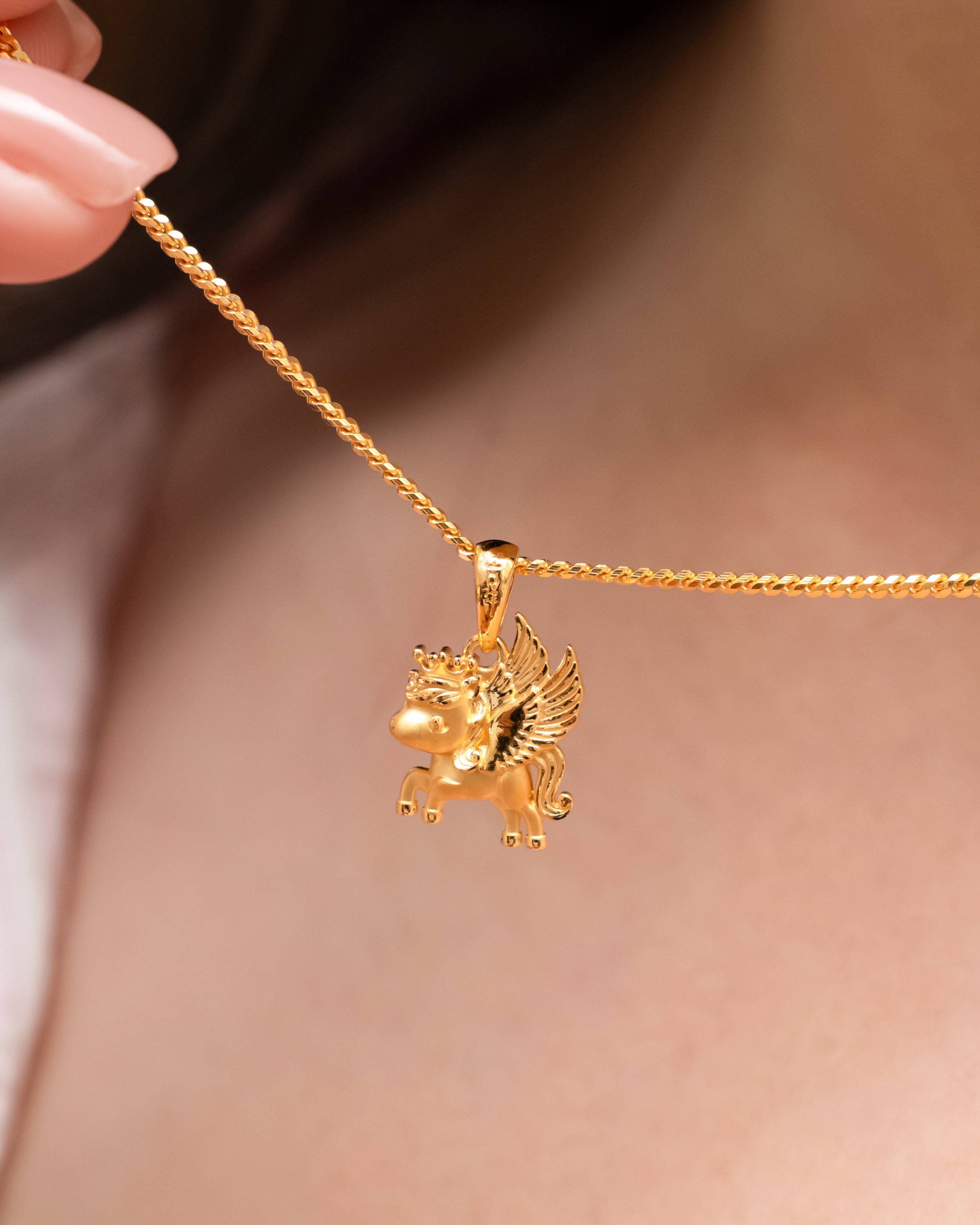 Inspired by the mythical flying horse, this pendant features a nimble and charming design, crowned with beaded details that enhance its noble character. The standout feature is its pair of golden wings, meticulously sculpted with layered feather textures and finely etched lines, creating depth and movement as if poised for flight. The design symbolises breakthrough, upward progress, and limitless potential, representing a future filled with growth and success.